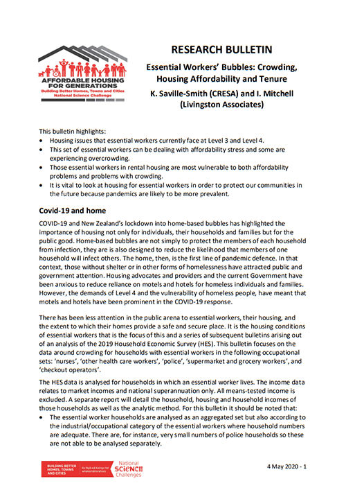 During the COVID-19 lockdown in Aotearoa New Zealand, research was done on the housing of essential workers. This bulletin highlights that a substantial number of these workers are dealing with affordability stress and some are experiencing overcrowding. It also discusses that those essential workers in rental housing are most vulnerable to both affordability problems and problems with crowding.
