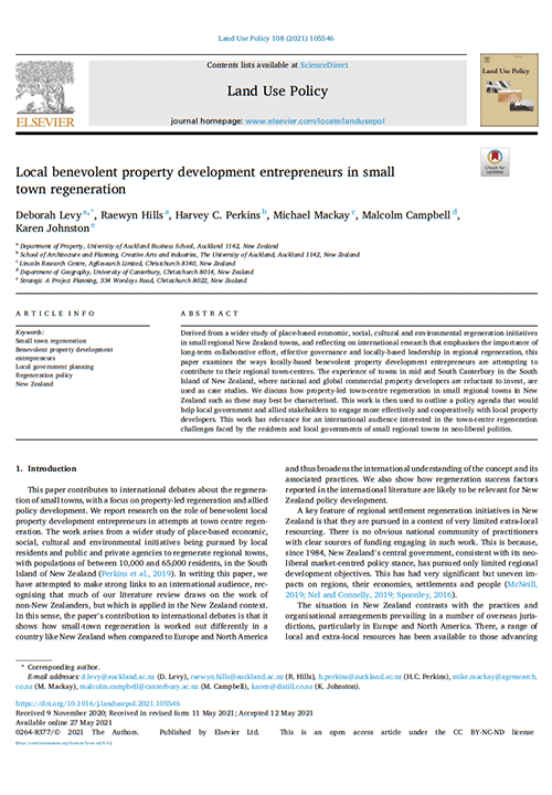 this paper examines the ways locally-based benevolent property development entrepreneurs are attempting to contribute to their regional town-centres. The experience of towns in mid and South Canterbury in the South Island of New Zealand, where national and global commercial property developers are reluctant to invest, are used as case studies. We discuss how property-led town-centre regeneration in small regional towns in New Zealand such as these may best be characterised. This work is then used to outline a policy agenda that would help local government and allied stakeholders to engage more effectively and cooperatively with local property developers. This work has relevance for an international audience interested in the town-centre regeneration challenges faced by the residents and local governments of small regional towns in neo-liberal polities.