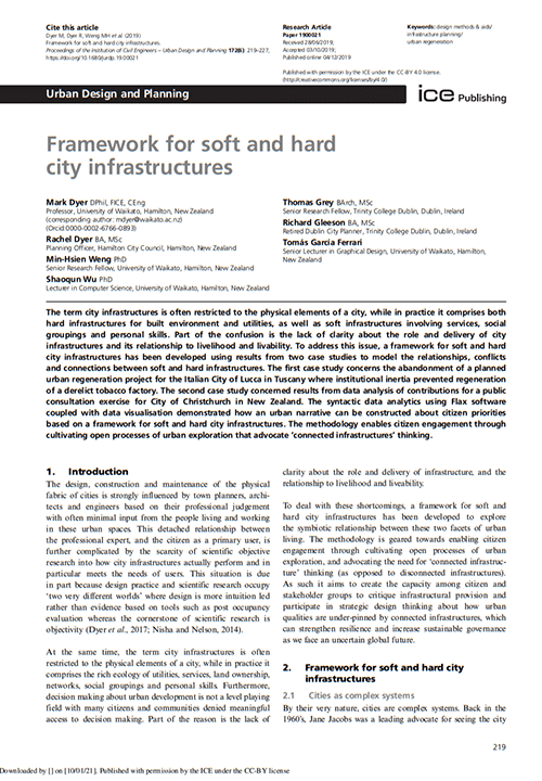 The unclear role of city infrastructures in relation to livelihood and livability has prompted the development of a framework for both soft and hard city infrastructures. This framework was developed based on two case studies: the halted urban regeneration project in the Italian City of Lucca and the public consultation data from the City of Christchurch in New Zealand. Using syntactic data analytics and visualisation, an urban narrative about citizen priorities was created, promoting a ‘connected infrastructures’ approach for better citizen engagement.